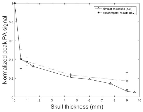We showed that the skull thickness and the location of the target relative to the inner-skull surface were the two major causes of attenuation and distortion; targets closer to the inner-skull surface and thicker skulls distort the PA signal more significantly (see Figure 9, Figure 10 and Figure 11).