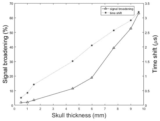 Time shift in the PA signal relative to that in the undisturbed signal is attributed to the difference in speed of sound in the bone as compared to that in soft tissue, which can be used as an indicator of the skull thickness in the ultrasound propagation pathway (see Figure 6a).