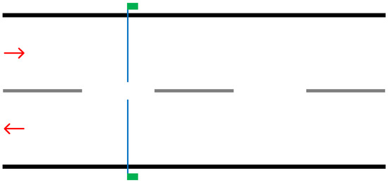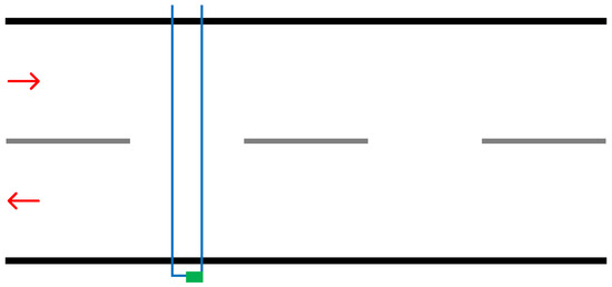Illustration demonstrating implementation of pneumatic road tubes. The blue lines represent the road tube and the green box representing the counting device.