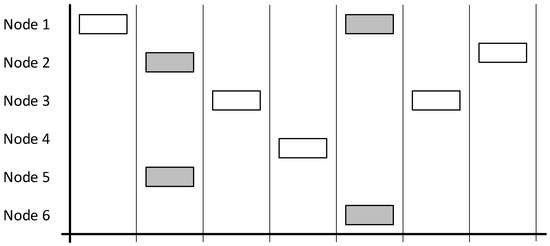 Diagram demonstrating a network using the slotted ALOHA protocol with grey boxes indicating collisions and overlapping. White boxes indicate successful communication.