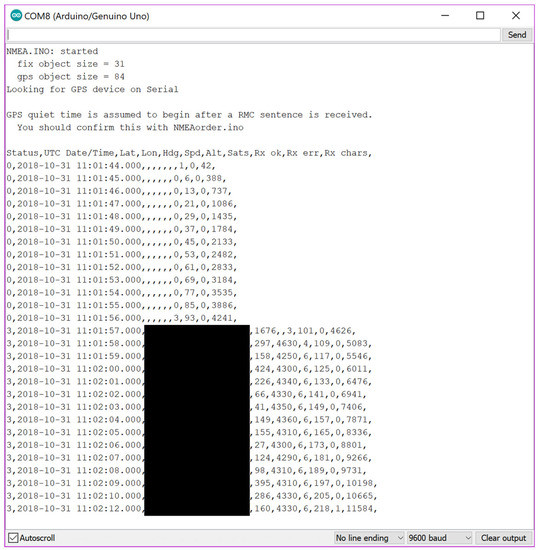 - Ublox. NEO-6-u-blox 6 GPS Modules-Data Sheet. Available online: https://www.u-blox.com/sites/default/files/products/documents/NEO-6_DataSheet_(GPS.G6-HW-09005).pdf (accessed on 31 October 2018).