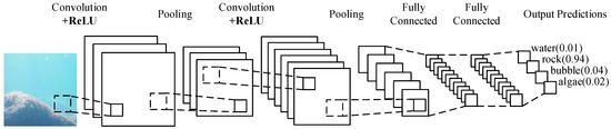 CNN is a variant of feedforward neural networks [15,28]. CNN uses convolution to reduce the proportion of images, while extracting different texture features in different ways, and then calculates the neural network. Convolution can not only reduce the computational amount of neural network image computation, but also extract features effectively. Thus, CNN includes input, several convolutions, pooling, neural network, and output. We usually describe the various parts of CNN as layers, so the structure of CNN includes the input layer, convolutional layer, pooling layer, full connected layer, and output layer. The outside of the input layer and the output layer is usually invisible, and we put them together and call them hidden layers. The main process of CNN is shown in Figure 1.