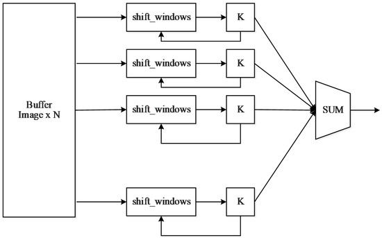 As shown in Figure 4, the left buffer will store N images of different depths. The shift_window is a convolution shift window that holds a 3 × 3 convolution matrix. K represents the convolution unit, and the weight of the convolution matrix is stored in K. After receiving the convolution data from the shift_window, the inner product operation starts immediately. At the end of the inner convolution operation, K sends an end request to the shift_window module, and SUM will get the result at this point, which accumulates the values of all depths and bias. The result is cached in the buffer, and as the memory read request ends, the cache writes the new point back into memory.