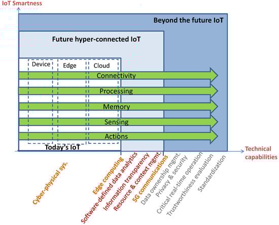 - Critical real-time operation: The IoT of the future should be flexible and adaptable to sudden changes of the status and conditions of the infrastructures. This is due in order to have fast response to critical situations such as the increasing frequency of natural disasters due to the global climate change [40]. Infrastructureless alternatives for communication in networks [41] or easy-to-deploy infrastructures [42,43] can help solve these problems.