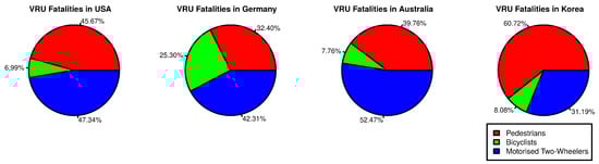 Pedestrians, cyclists, and motorized two-wheeler operators are called Vulnerable Road Users (VRUs). According to the International Traffic Safety Data and Analysis Group (IRTAD), in 2012, there were 1605 and 10,386 VRU fatalities in Germany and USA respectively []. Figure 1 shows the proportion of different types of VRU fatalities in the USA, Germany, Australia, and Korea []. It shows that VRU groups have differing rates of fatalities among different countries. There have been numerous advancements to improve safety features of vehicles as part of Intelligent Transportation Systems (ITS). These safety features help improve safety of vehicle-occupants as well as VRUs. Vehicle-to-Everything (V2X) communication is one such safety feature that establishes communication among various entities on road for co-operative safety. V2X involves communication between Vehicle-to-Vehicle (V2V), Vehicle-to-Infrastructure (V2I), and Vehicle-to-Pedestrian (V2P). V2P is an umbrella term that encompasses the communication between vehicles and all types of VRUs. By enabling V2P for VRUs, they can become active part of ITS and can enable various safety and convenience ITS applications.