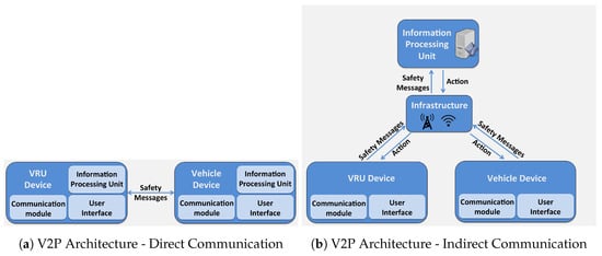 Indirect mode of communication involves vehicles and VRUs communicating with each other indirectly i.e., through infrastructure. References [,,,,,] are a few examples of the V2P systems for VRUs that use the indirect mode of communication. The devices may be equipped with same technology, such as cellular [], or with different technologies, such as 802.11p and Wi-Fi []. As the exchange of messages happens through the infrastructure, the system may first process the messages in infrastructure nodes before forwarding them to other nodes. This may require the infrastructure nodes to have high computing power. Also, the exchange of messages through infrastructure nodes may cause higher communication latency. This imposes the requirement that the latency constraint of the target V2P application must be assessed against the infrastructure latency.