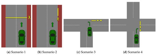 Various pre-crash scenarios. (a) Pedestrian crossing in front of vehicle; (b) Pedestrian moving parallel to vehicle; (c) Vehicle turning left into cyclist’s path (d) Vehicle turning right into cyclist’s path.