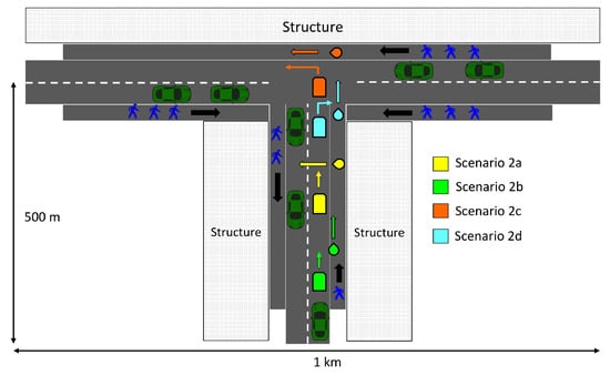 Anaya et al. [] have developed a Bluetooth-based V2P safety system for bicyclists. This system uses iBeacon as a VRU device in order to communicate with the vehicle directly. It achieves a communication range of up to 50 m which may be enough for a particular pre-crash scenario e.g., Figure 3d. However, due to its limited communication range, Bluetooth may not be able to support V2P in its entirety. For example, it may support only urban scenarios with slower speeds.