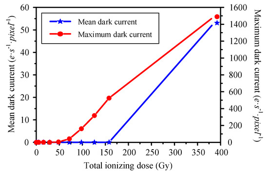 The overall behavior of the mean dark current and the maximum dark current during irradiation is shown in Figure 3. We described the mean dark current and the maximum dark current as a function of the TID; there was a damage threshold in the TID effect. As shown in Figure 3, no obvious dark current change was exhibited before 50 Gy; the maximum dark current of the pixels began to increase after 50 Gy, but the mean value increased less; the dark current of several pixels began to increase sharply with a relatively large TID of more than 150 Gy. Therefore, all of the sensor samples had to be irradiated at less than 50 Gy during the radiation response experiments.