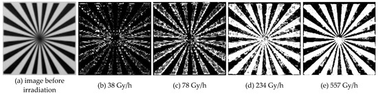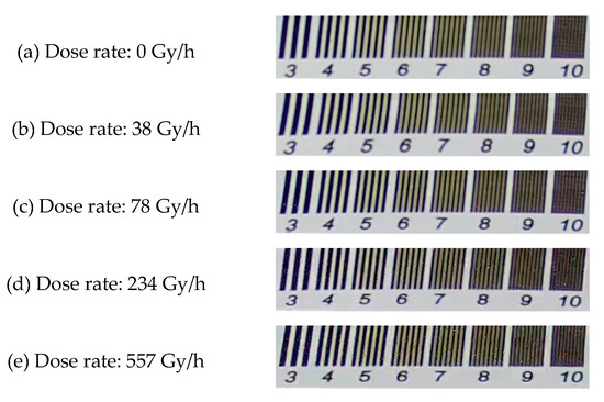 White noise appeared in the resolution test, but there was no blur and resolution decrease in the images, and the boundary of the black and white stripes became more obvious at the start of the irradiation, as shown in Figure 9. Thus, we concluded that, under sufficient light, there was no significant performance deterioration of 4T-APS before the TID reached the damage threshold.