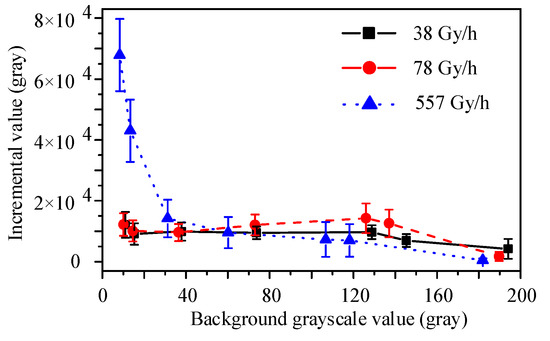 The curves shown in Figure 7 indicate that images with a smaller grayscale background have a greater incremental value. At the irradiation dose rates of 38 and 78 Gy/h, the incremental value of the images with a background grayscale value of less than 129 (gray) was greater than the value for frames with a larger background grayscale. The incremental value of images with a background grayscale value of less than 38 had a distinct difference at the irradiation dose rate of 557 Gy/h. This was attributed to the fact that the radiation response in the images could be described as an additional value of the background. Pixels with a lower background grayscale had more space to store and transfer the charges generated by the γ-ray ionizing irradiation, but the grayscale value of pixels with a higher background could easily reach saturation (255 gray).