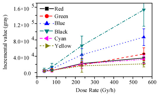 The mean grayscale incremental values obtained for the 5-min video of γ-ray irradiation were calculated using function (2). The relationship between the grayscale incremental value and the irradiation dose rate for different colors and different grayscale backgrounds is shown in Figure 7 and Figure 8.