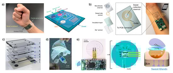 (a) Images of the wearable sensor reported by Gao et al. that is placed on a subject’s wrist, integrating the sensor array and wireless transmission. The array consisted of glucose-, lactate-, sodium- and potassium-selective electrodes together with the reference electrode (PVB reference membrane) and the temperature sensor. GOx and LOx are glucose and lactate oxidase, respectively. Reproduced from [] with permission from Springer Nature. (b) Scheme of the four layers that constitute the wearable sensing patch reported by Nyein et al. The spiral Au electrode for sweat rate sensing is aligned with the microfluidic channel. The sodium and reference electrodes are placed in the sweat collection reservoir. The path can be worn on the user’s wrist and the data is wireless transmitted to a phone via Bluetooth. Reprinted from [], with permission from the American Chemical Society, Copyright 2018. (c) Image of the different layers employed to produce the wearable sensor reported by Matzeu et al. Reproduced from [] with permission from The Royal Society of Chemistry. (d) Image of the sweat patch developed by Alizadeh et al. The dimensions are 10.5 cm × 9.7 cm. Reproduced from [] with permission from The Royal Society of Chemistry. (e) On the left: Photograph and schematic of the microfluidic device integrated with the and electrodes described by Sempionatto et al. On the right: Skin-mounted device, which comprises a three-layered configuration. Reproduced from [] with permission from John Wiley & Sons, Inc.