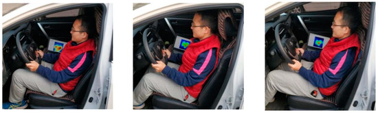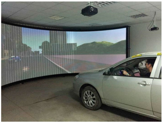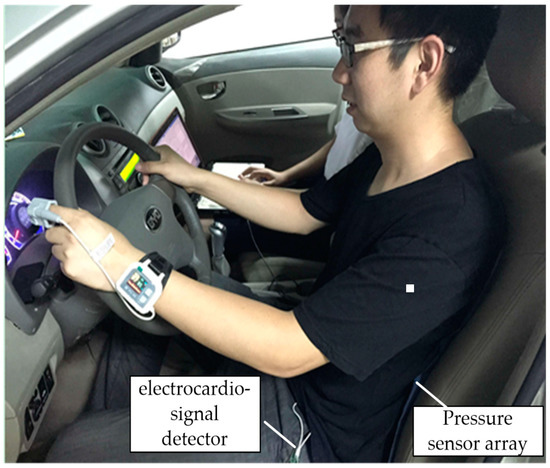 The simulated driving test was performed on the SCANeR simulation training system manufactured by OKTAL, LTD in France (Figure 4), which provides a virtual 3D urban road traffic scene for the driving simulation experiment. The electrocardio-signal detector and pressure sensors array were installed as demonstrated in Figure 5.