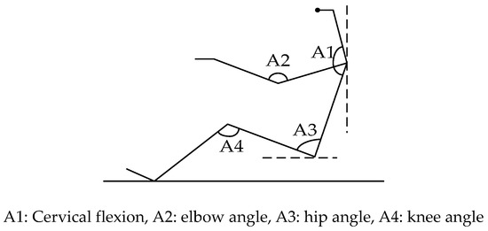 A postural angle model is shown in Figure 6. Cervical flexion, elbow angle, hip angle, and knee angle were selected as dependent variables to evaluate the driving posture [20].