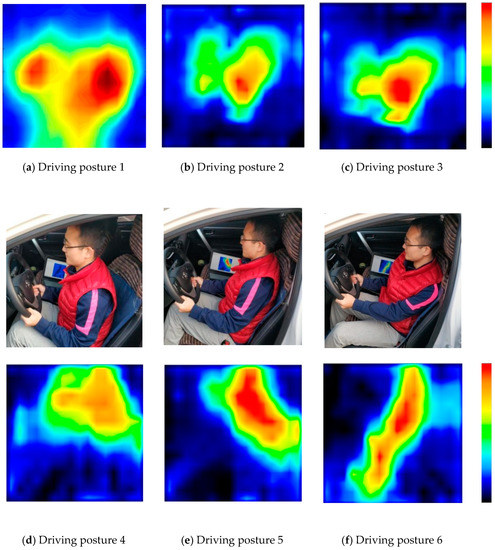 In order to discuss the applicability of the unconstrained monitoring method for heartbeat signals measurement under an unsuitable sitting posture, the body left leaning at 10° and the body right leaning at 10° in the driving posture 1 (postural angle A1:145–155,A2: 115–120,A3: 102–106,A4: 124–130) were chosen as driving postures 5 and 6. Take subject 1 as an example, the driving posture and pressure distribution in driving posture 1 is shown in Figure 7. The color maps of the pressure distribution were measured by the 16 × 16 pressure sensors array.
