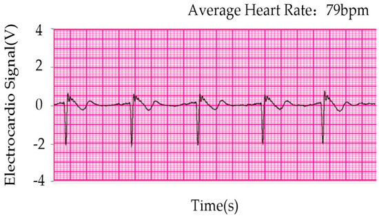 IFFT (inverse fast Fourier transform) was used to obtain the processed time domain signal. Figure 10 depicts the time domain signals of the maximum pressure point in number 181. Figure 11 exhibits the time domain signals in number 181 after processing. The electrocardio-signals are monitored simultaneously, as displayed in Figure 12. The heartbeat signal cycle is the same as the electrocardio-signals presented in Figure 12 despite the evident noise that is demonstrated in Figure 11.
