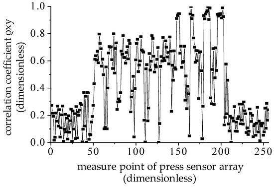 The correlation coefficient, |ρxy|, of the electrocardio-signals with 256 sets of heartbeat signals in driving posture 1 was calculated and is displayed in Figure 13. In accordance with the definition of the correlation coefficient, |ρxy|=1 indicates a strong correlation between two signals, and |ρxy|= 0 when the two signals are independent. In Figure 13, the correlation coefficient between electrocardio-signals and 256 measurement points on the pressure sensor are varied. The correlation coefficient in measuring points 0–50 and 200–256, where the driver’s back is not in close contact with the backrest, is less than 0.4, thereby exhibiting a non-correlation. However, the correlation function values in measuring point 50–200, where the driver’s back is in close contact with the backrest, are in the range of 0.8–1. The highest correlation coefficient was 0.99 in the maximum pressure signal point 181 (Figure 9) given the intimate contact between the driver and backrest where the pressure sensors were set up. Therefore, the optimum monitoring points can be obtained by searching the monitoring points with the maximum correlation coefficient.
