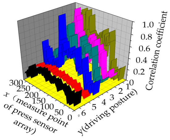 To obtain the optimal measure point considering the varied driving postures, the correlation coefficient between the electrocardio-signals and heartbeat signals are illustrated in Figure 14. From driving postures 1–4 in the y-coordinate, the change in the maximum pressure point caused by the driver’s posture corresponds to the maximum correlation coefficient. Thus, the heartbeat signals in the four driver postures can be extracted from the pressure signal. In driving postured 5 and 6, the correlation coefficients in all measuring points were below 0.4, thereby indicating that electrocardio-signals can be hardly extracted in the two driving positions. Table 2 presents the measuring point optimization selection in varied driving postures in accordance with the correlation coefficient analysis.