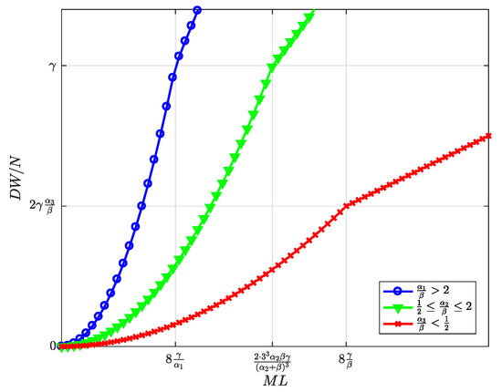 Figure 10, Figure 11, Figure 12, Figure 13 and Figure 14 represent the welfare expressions, normalized to N, as a function of the user-developer population product, , for three different ranges of the value of . The normalization is motivated by the fact that the expressions are proportional to N.