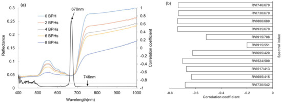 Reflectance from a rice plant exposed to 0–8 BPH nymphs for six days and the correlation coefficients (the black curve) between reflectance in each 1 nm wavelength from 400 to 1000 nm and the number of BPH (a), and the correlation between the ratio vegetation index and the number of BPH (b). The horizontal dash line in (a) represents the significant level of the correlation coefficient at p = 0.05.