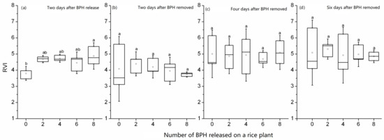 RVI746/670 of rice leaves exposed to 0–8 second-instar nymphs of BPH in two days (a) and 2–6 days after BPH exposure (b,c,d). In the box plot, the box represents the 25th and 75th percentiles; whiskers represent the minimum and maximum values; the line in box represents the median percentile; the open circle in a box represents the mean. The different letters above the box plots show significant differences in the RVI746/670 means among different numbers of BPH at p = 0.05 level.