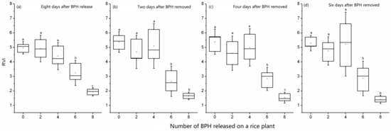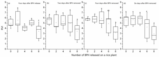 RVI746/670 of rice leaves exposed to 0–8 second-instar BPH nymphs for six days (a) and 2–6 days after BPH exposure (b, c and d). In the box plot, the box represents the 25th and 75th percentiles; whiskers represent the minimum and maximum values; the line in box represents the median percentile; the open circle in a box represents the mean. The different letters above the box plots show significant differences in the RVI746/670 means among different numbers of BPH at p = 0.05 level.