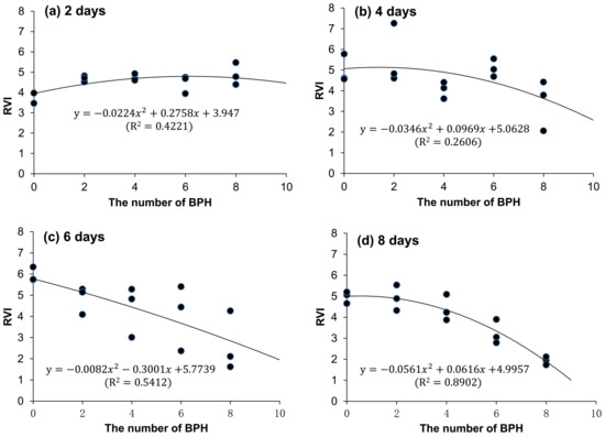 Relationships between RVI746/670 of a rice plant and the number of BPH nymphs damaged rice for 2 (a), 4 (b), 6 (c), and 8 (d) days.