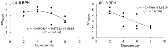 The RVI746/670 from a rice plant decreased as the exposure day to 6 and 8 BPH nymphs extended from two to eight days (Figure 8). The relations between RVI746/670 from a rice plant and exposure day could be simulated by a quadratic curve for the exposure to 6 nymphs (F2, 9 = 3.21, p = 0.089; Figure 8a) and by a linear model for the exposure to eight nymphs (F1, 10 = 17.07, p < 0.01; Figure 8b). The spectral index RVI746/670 of rice plants is sensitive to exposure day to BPH.