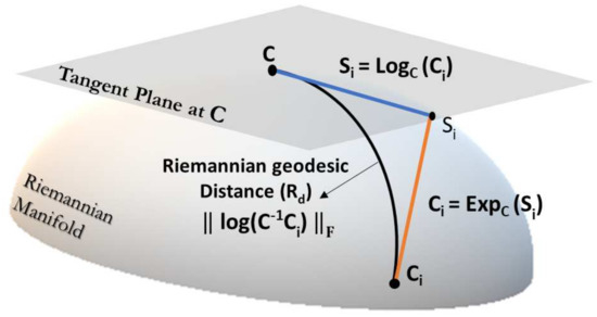 where C is a reference point in the manifold where the tangent plane is mapped and is logarithm of SPD matrix given in Equation (2). Furthermore, the tangent vector from tangent space is projected back to manifold using exponential mapping given by