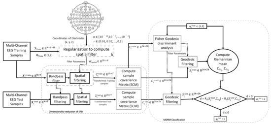 The conceptual framework of our proposed methodology is shown in Figure 2. EEG signals are often divided into trials based on the label given during training phase. Let ∈ () be a bandpassed EEG trial where N is number of electrodes and T is sampled time points in the trials and trial labels . Therefore, the training set can be given as where M is the total number of training trials. The covariance matrix for trial is calculated as follows: