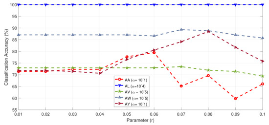 Classification accuracy of all subjects from Dataset IVa with respect to parameter r and best value of .