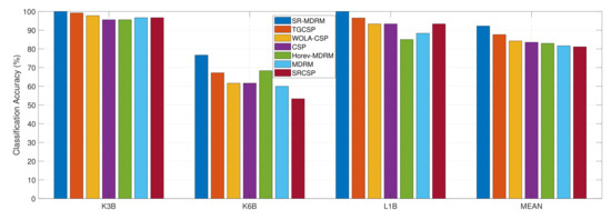 As shown in Table 6 the SR-MDRM method improves the mean classification accuracy by , , , , , and in comparison with SS-MEMDBF, MDRM, WOLA-CSP, SRCSP, CSP, , and , respectively.