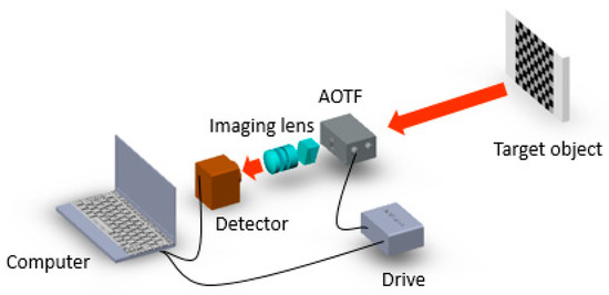Simplified structure of the traditional short-wave infrared (SWIR) AOTF imaging spectrometer. The focal length of the imaging lens is 73 mm. The AOTF aperture is an aperture stop in the system. The AOTF and the detector are controlled by software. The target object is a checkerboard.