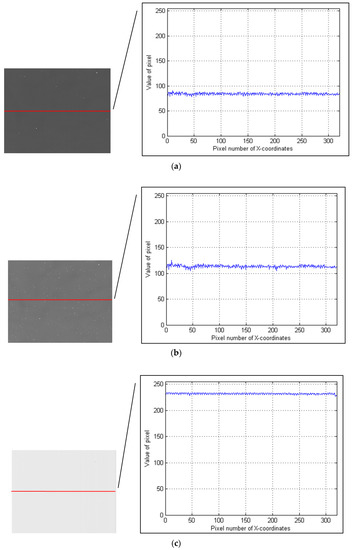 The result of the experiment is shown in Figure 8. Obviously, the image collected by an 8-mm lens had a high contrast ratio. Meanwhile, we obtained a row of data from each image. The value of the bright pixel in the 8-mm image was about 16,000–18,000 and the value of the bright pixel in the 73-mm image was about 220–240. Therefore, the response of the 8-mm focus system was about 72–75 times larger than that of the 73-mm focus system.