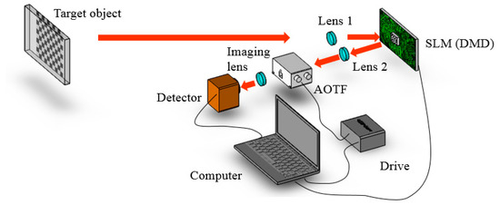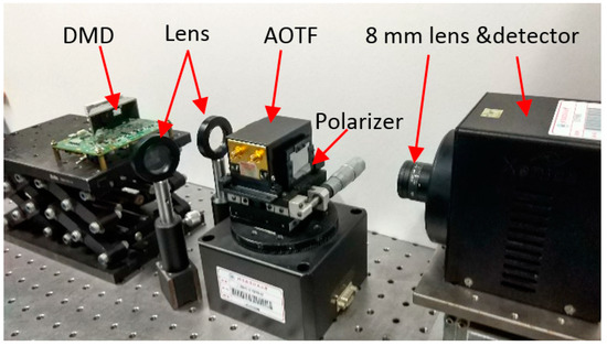 The real conditions of our experiment are depicted in Figure 11. All the elements were adjustable to regulate the optical path expediently. The object was placed approximately 1 m away from the DMD. The PC controlled the acquisition sequence between the AOTF drive, DMD, and detector.