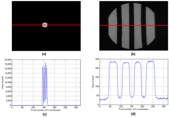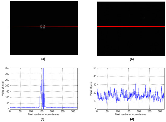 Images of strong light conditions. (a) Image acquired by the 8-mm lens, (b) image acquired by the 73-mm lens, (c) the row of data from the red line shown in (a), (d) the row of data from the red line shown in (b). The data here are the results of 16-bit quantization. For a better display, (a,b) are not shown in the same grayscale. The response of the 8-mm focus system was larger than that of the 73-mm focus system. However, the images from the 8-mm lens had a low resolution.