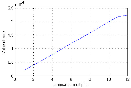 Due to the camera response, the irradiance was linear (Figure 9) when the number of pixels was less than 20,000. The irradiance of the short-focus system was also 72–75 times higher than that of the long-focus system.
