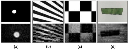 Different target objects and their image results. The objects in (a–d) correspond to the white circle, oblique stripe, checkerboard, and cut leaf, respectively.