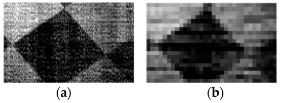 The resolution of the images varied in accordance with the mask template, when SPI was adopted. From the different applications, we can obtain images of different resolutions. Therefore, in this experiment, we used 32 × 20 and 128 × 80 Hadamard masks as a comparable pair. As can be seen in the different resolutions (Figure 13), the resulting object was an oblique square pattern. The difference was clear because the edge of the 32 × 20 image was pixelated. However, the acquisition time was much longer in the high-resolution image than in the low-resolution image.
