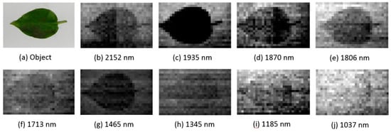 The spectral images of different bands from an imaging spectrometer are displayed in Figure 14. The target object was a leaf, and the background was white paper, which can be regarded as a standard reflectance.