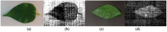 Initially, the RF was adjusted to 49 MHz, and the passband was approximately 1935 nm. The target objects were a real leaf and a polyester fiber leaf. For improved illustration, a black background was placed behind the fake leaf, and a white background was placed behind the real leaf. The acquired images are depicted in Figure 15. The bright leaf in Figure 15d is the fake leaf, and the dark leaf in Figure 15b is the real leaf.