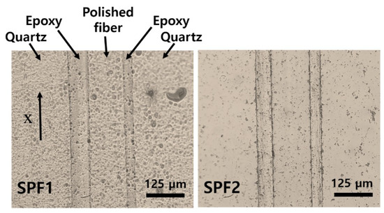 Top views of two side-polished fiber (SPF) sensors with different surface roughness. The left arrow indicates the direction of x-axis defined here as parallel to the longitudinal direction of fiber.