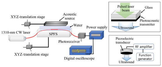 The SPFS was operated by using a continuous-wave (CW) probe laser beam (1310-nm wavelength; Thorlabs, USA) as an input, as shown in Figure 2. The output optical signal was detected by a broadband photoreceiver (125-MHz bandwidth; Newport, USA). Two types of acoustic sources were used to characterize the SPFS, shown by two inset boxes in Figure 2. As an acoustic input for broadband characterization, we used thin-film photoacoustic transmitters. Both carbon nanotube (CNT)-polydimethylsiloxane (PDMS) composite with > 30 μm thickness and Cr coating having 100 nm thickness, shown by the top inset box in Figure 2 [30,31]. For a plane wave configuration, these transmitters were closely positioned with 1.5-mm distance from the SPFS. Under pulsed laser irradiation (532-nm wavelength and 6-ns width; Litron laser, UK), these transmitters could produce short ultrasonic pulses replicating the temporal shape of an incident optical pulse [30,32]. For comparison, we used a calibrated polyvinylidene difluoride (PVDF) needle hydrophone with 1-mm diameter (Precision Acoustics, UK) replacing the SPFS in Figure 2.