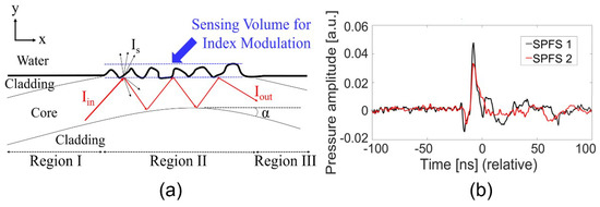 (a) A schematic diagram showing SPFS operation (α = 0.114°). The sensing volume increases with polish-induced roughness at the core surface. (b) Acoustic signal waveforms for two sensors with different roughness. The signal-to-noise ratio (SNR) increases with the roughness (in this example, 17.4 and 15.74 dB for SPF1 and SPF2, respectively).