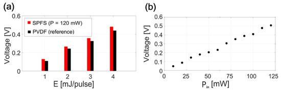 From the CNT-PDMS, the measured peak pressure values were consistently higher for the SPFS as the input pressure increased as demonstrated in Figure 5a. The SPFS provided peak values of 0.13, 0.26, 0.36, and 0.48 V for E = 1, 2, 3 and 4 mJ/pulse, each of which was 15%, 12%, 12%, and 11% higher than the values measured by the reference detector (0.11, 0.23, 0.32, and 0.43 V), respectively. In the SPFS, the strength of an output signal increased with probe laser beam power (Pin) as demonstrated in Figure 5b. For a fixed input pressure generated by the CNT-PDMS transmitter (E = 4 mJ/pulse), a linear increase trend was confirmed for Pin = 10–120 mW. The SPF output strength was limited by the maximum-available power of the probe laser source (120 mW).