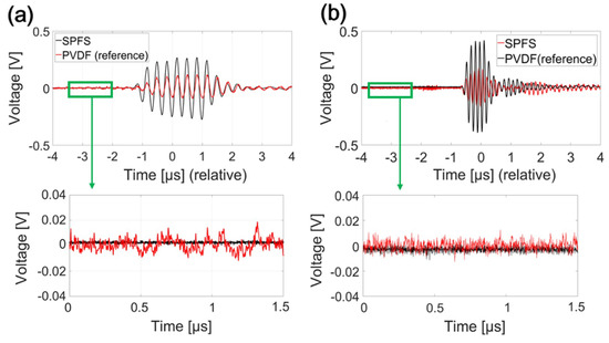 For the above noise analysis using the 7-MHz concave source, we avoided choosing the crosstalk signal shown between −2 and −1 μs range in Figure 6b. The early-arriving crosstalk in the SPFS is caused by a geometrical shape of the 7-MHz source. Ultrasound generated from the protruded outer region of concave curvature first strikes the surface of quartz substrate with a full area is 30 × 10 mm2, see Figure 1; SPF is embedded in the quartz substrate and exposed on the same surface. Then, lateral propagation along the top surface can cause the early-arriving crosstalk in the SPFS. For the PVDF hydrophone, it was not explicitly observed in Figure 6b because the size of circular probe (1-mm diameter) is only 1/5 of the source dimension.