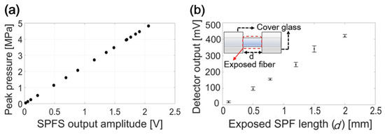 The SPFS is a robust ultrasound sensor because there is no additional coating on the polished glass surface. Device robustness was tested by using high input pressure amplitudes with an order of MPa. The 7-MHz piezoelectric transducer was used as a calibrated source. In Figure 7a, the input pressure was increased up to 4.8 MPa to avoid the possible cavitation-induced damage on the SPFS. Figure 7a shows the reliable linear relationship between the SPFS output and the converted pressure amplitudes shown in the MPa unit.