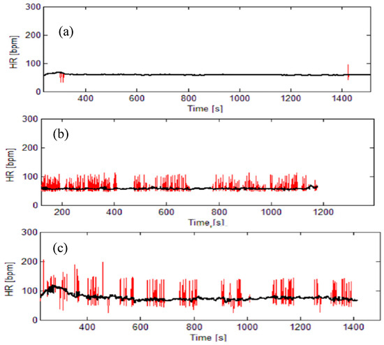 Typical heart rate (HR) signals: red lines-raw signals with artifacts, black lines—corrected signals. (a) almost ideal signal; (b) signal with artifacts; (c) signal with ectopic beats (and artifacts). The signals (b) and (c) cannot be used for further processing.