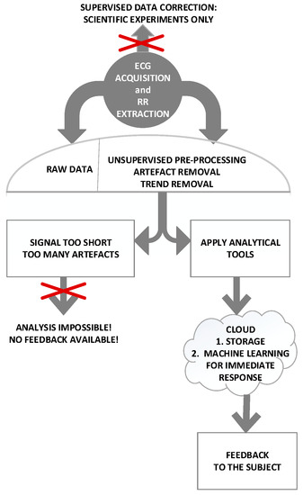 In the scientific experiments, artifacts are removed by visual inspection and each study contains a statement “after a long and tedious visual observation, the artifacts are corrected”. It is of the uttermost importance, as most of the features used for cardiovascular analysis are extracted from RR (or HR) time series. Though reliable, visual methods cannot be applied in crowd sensing where it is not expected that the subject would spend more time than necessary to turn the application on and off. To eliminate the artifacts and other obstacles in MCS applications, raw RR signals (corresponding to the red lines in Figure 2), must be pre-processed. The artifacts should be removed using a filter designed specifically for RR time series [19], while the signal stationarity should be assured by removing the slow-varying trend using another filter, also designed for RR time series [20]. If necessary, the signals should be resampled to be equidistant (1 Hz). We have avoided other interval time series that can be derived from ECG, as the software artifacts are more frequent and the algorithms for their elimination less reliable. After the pre-processing, short signals [18] and signals with too many artifacts are discarded. The remaining signals are then processed in order to extract the features which are transmitted to the remote end (cloud) and, as a feedback, an information of the subject’s status is reported.